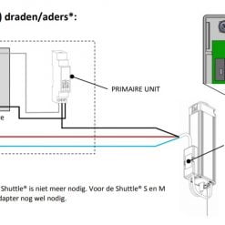 - Primaire unit: wordt alleen gebruikt wanneer 3 (+1 aarde PE) draden geïnstalleerd zijn i.p.v. 4 (+1), tussen de aansturing en de Shuttle® motor. Het zet de twee Live AC draden om in één draad.