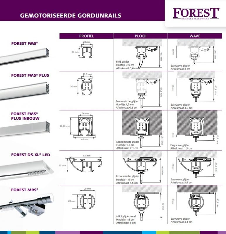 Zie deze tabel met de afmetingen van de gordijn positie bij Forest gemotoriseerde gordijnrails